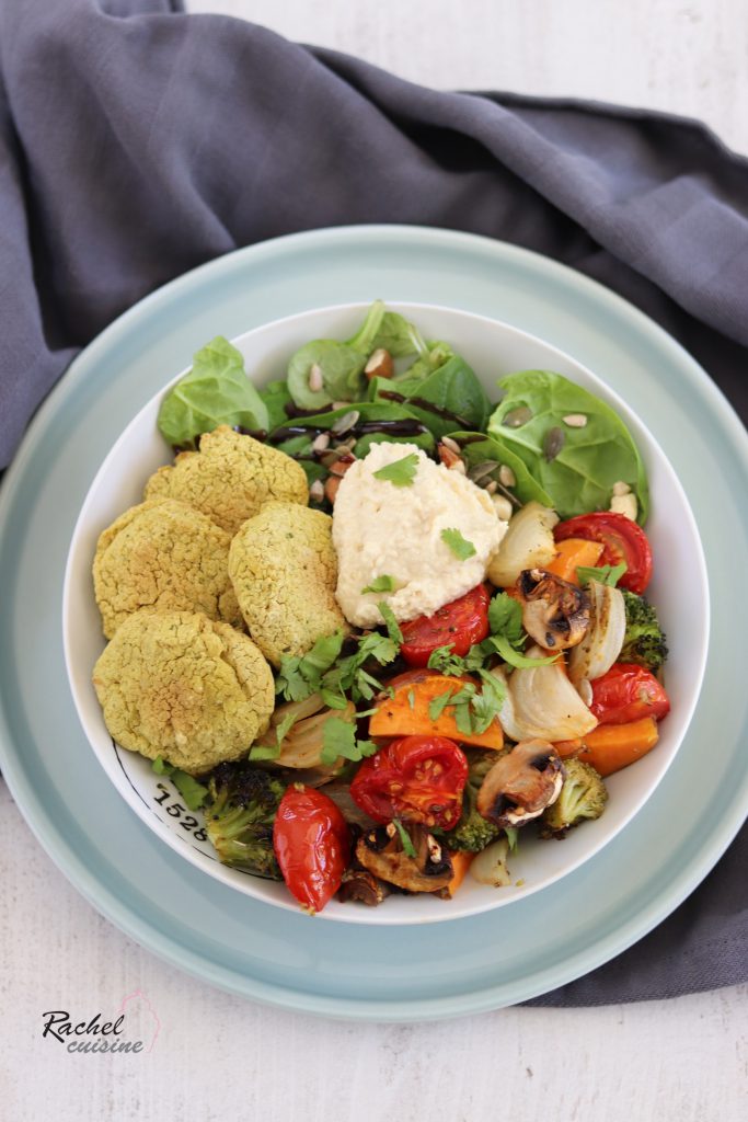 Dans une assiette creuse, mettre de la salade, les légumes au four (avec les patates douces), les falafels et l’houmous au milieu.